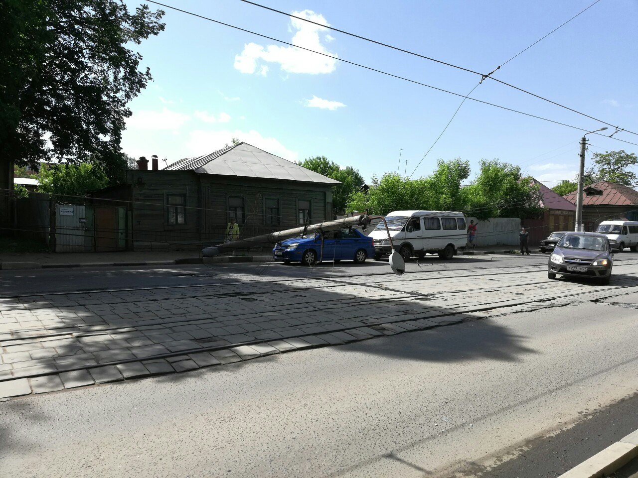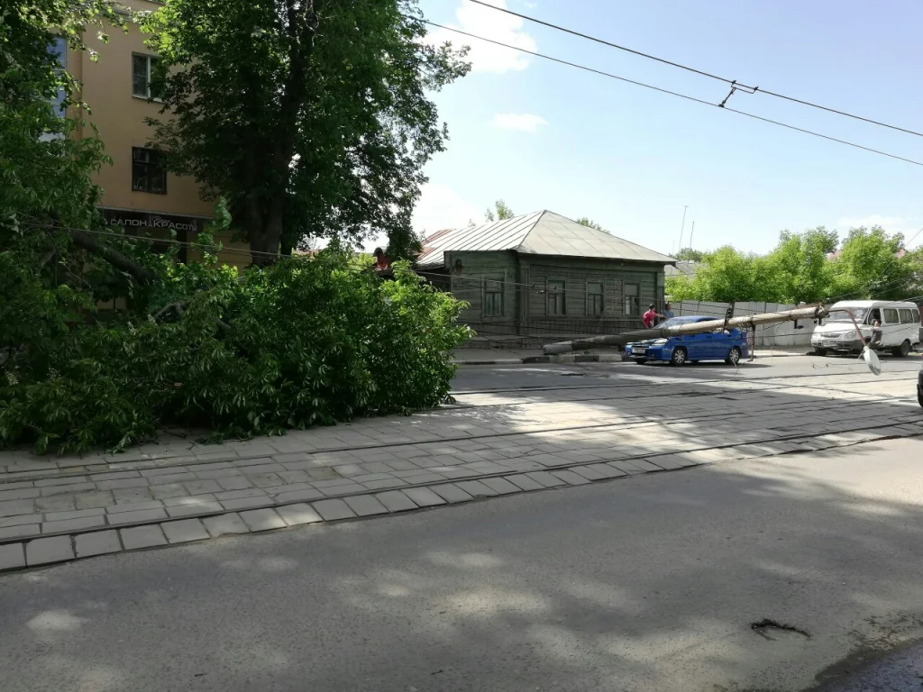 На ул. Оборонной, напротив педколледжа, буквально в 10 метрах друг от друга на дорогу упали дерево и фонарный столб с проводами. Столб придавил автомобиль и перегородил движение транспорта. В результате ЧП встали трамваи №12 и №13.