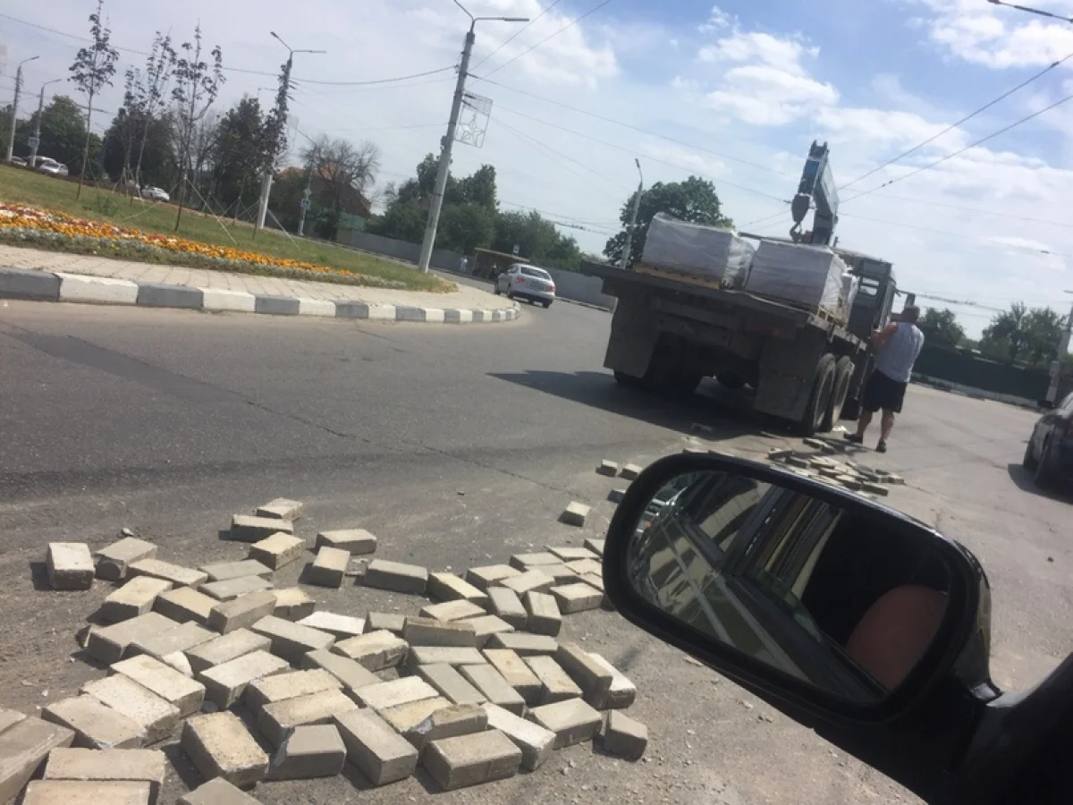 Днем 29 июня на кольце ул. Короленко в Туле произошла необычная авария. Водитель автокрана, перевозивший кирпичи, рассыпал часть вверенного ему груза прямо на дороге.