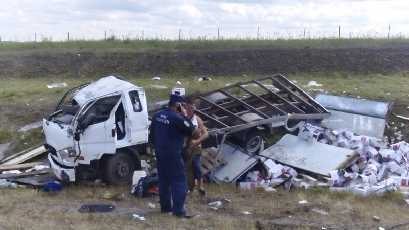 ДТП произошло в 10:17 на 252-м км трассы М4 «Дон». Водитель автомобиля «Лада Ларгус» не справился с управлением и влетел в грузовик «Хёндай». В результате столкновения грузовик съехал в кювет и «растерял» весь груз — вся обочина завалена коробками и деревянными поддонами.
