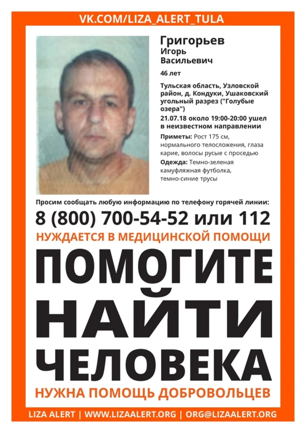 Григорьев Игорь Владимирович, 46 лет. 21 июля 2018 около 19:00-20:00 ушёл в неизвестном направлении. До сих пор его местонахождение неизвестно.