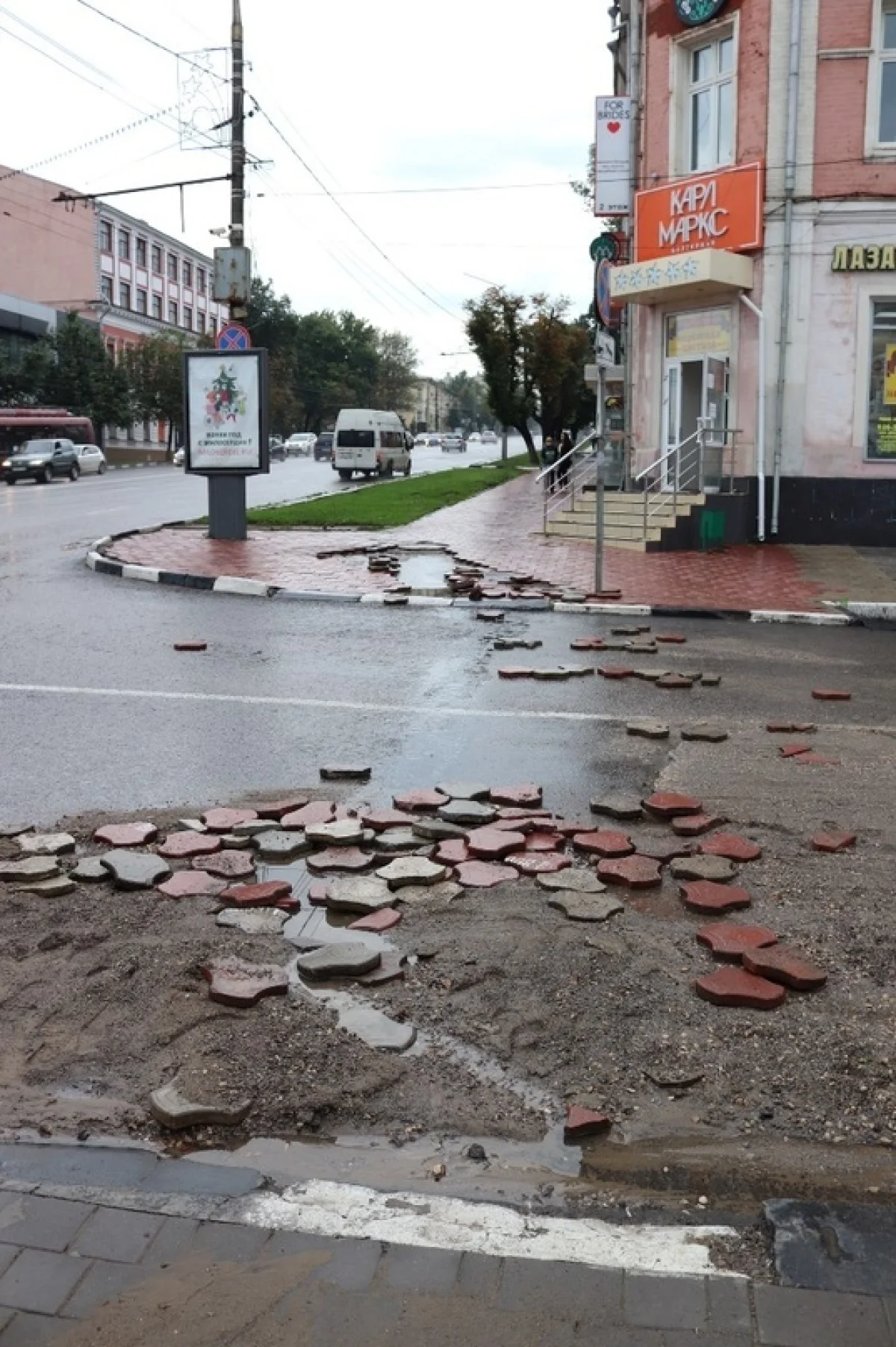 В Туле потоки дождя смыли тротуарную плитку и «разъели» асфальт