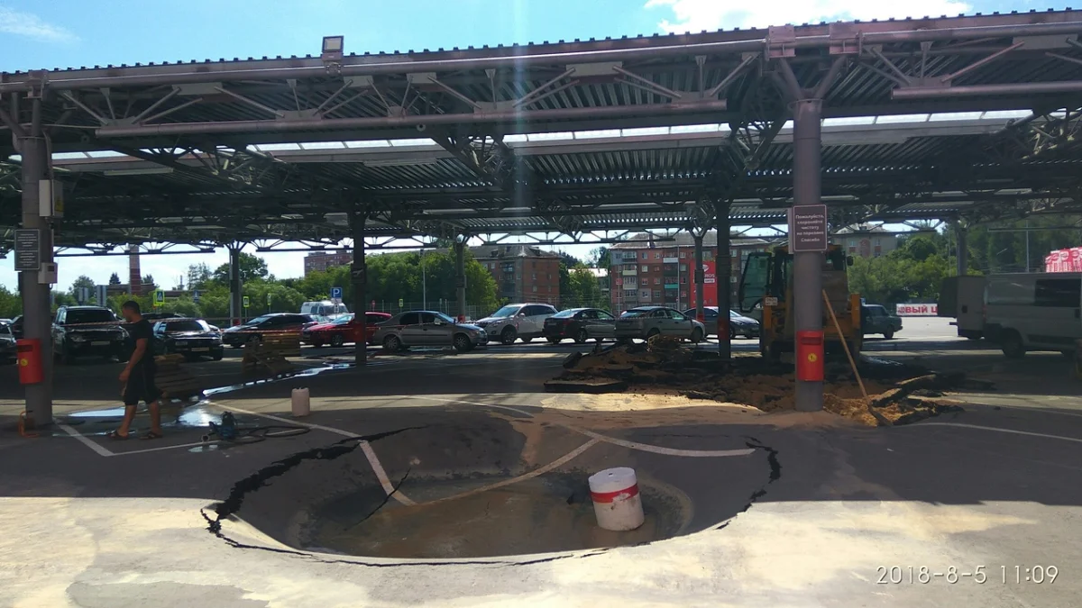 Кадрами поделились пользователи соцсетей. На них видно, как образовался огромный провал около у гипермаркета