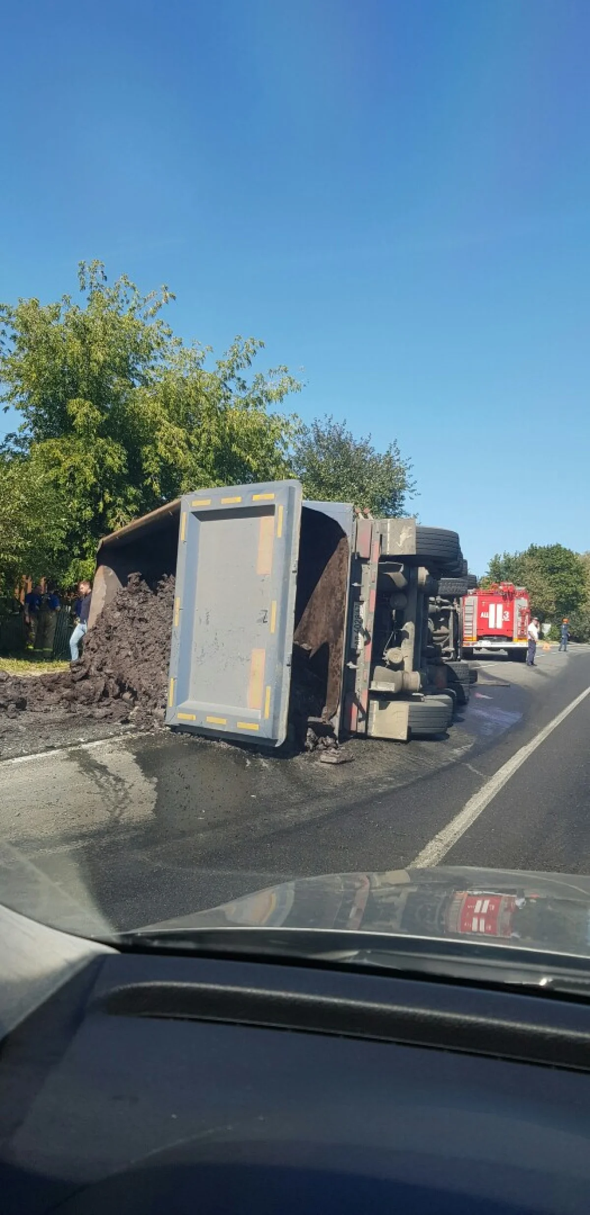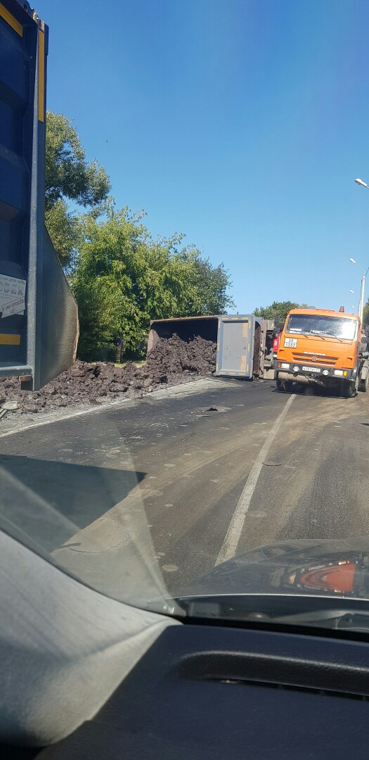 Об этом очевидцы сообщают в соцсетях. Грузовик, перевозивший то ли землю, то ли уголь, опрокинулся на бок.