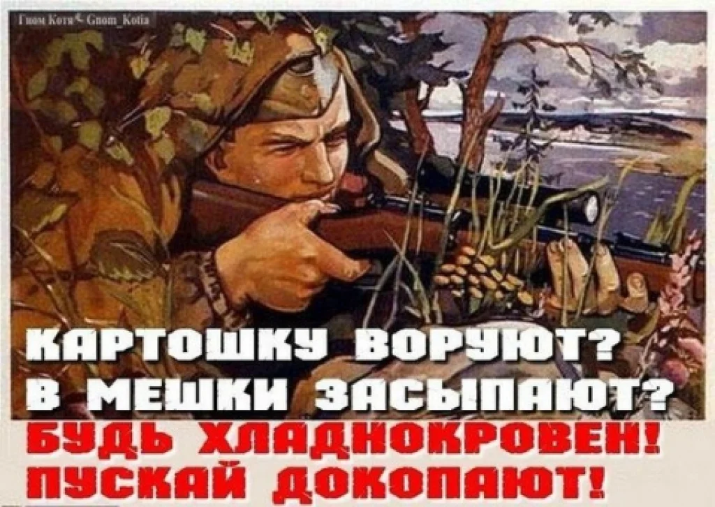 Супружеская пара решила запастись на зиму картофелем. Но зачем покупать, когда можно бесплатно выкопать на колхозном поле. Захватив лопаты и тележку, супруги отправилось «на дело».
