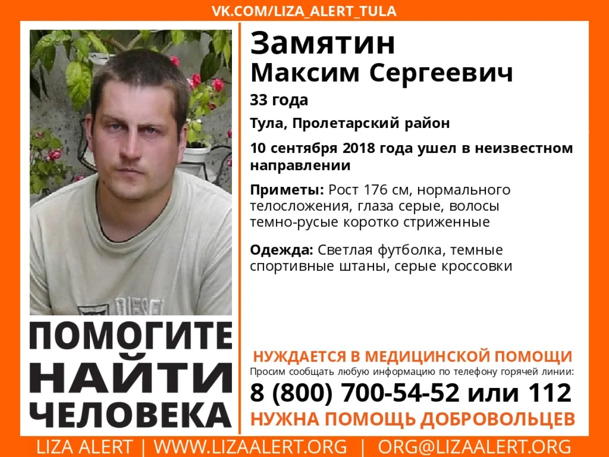 Замятин Максим Сергеевич, 33 года. 10 сентября ушел из дома в неизвестном направлении. С тех пор его местонахождение неизвестно.