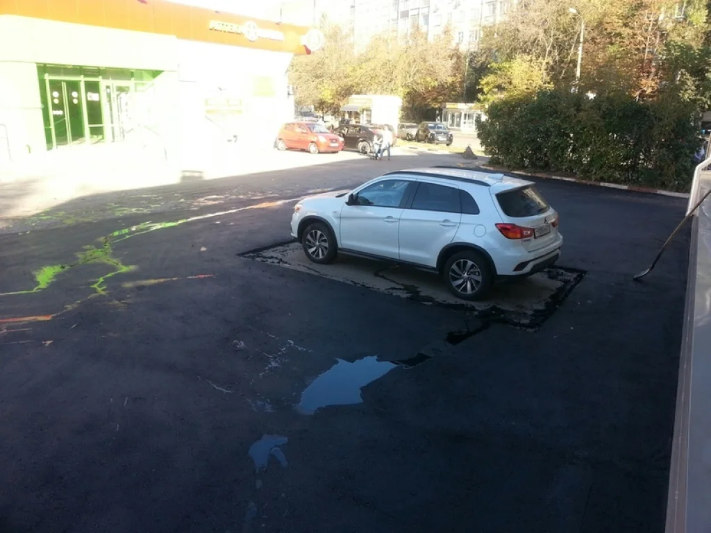 Припаркованная машина — не повод переносить работы, - решили рабочие и обложили иномарку асфальтом.