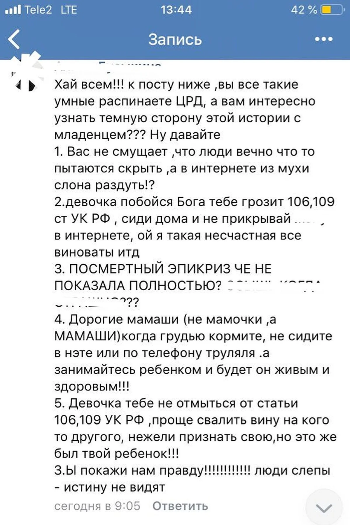 Напомним, тулячка Анастасия К. разместила в соцсетях пост, в котором пожаловалась на врачей Центрального роддома. Якобы по их вине скончался её новорожденный сын. Женщина в красках описала свою версию случившегося и спросила совета, как добиться справедливости.
