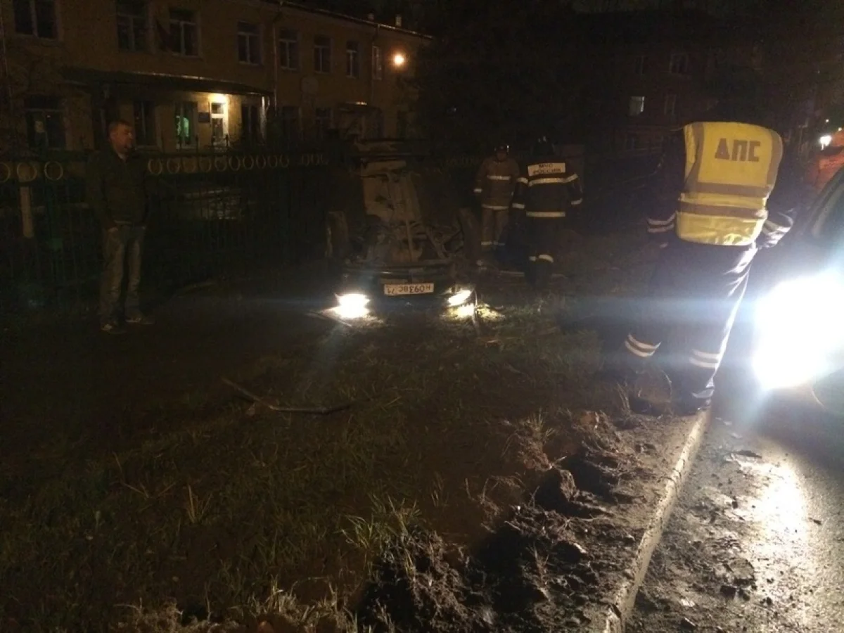 Пьяный водитель иномарки вылетел с дороги на газон и врезался в забор детского сада. В результате машина перевернулась на крышу.