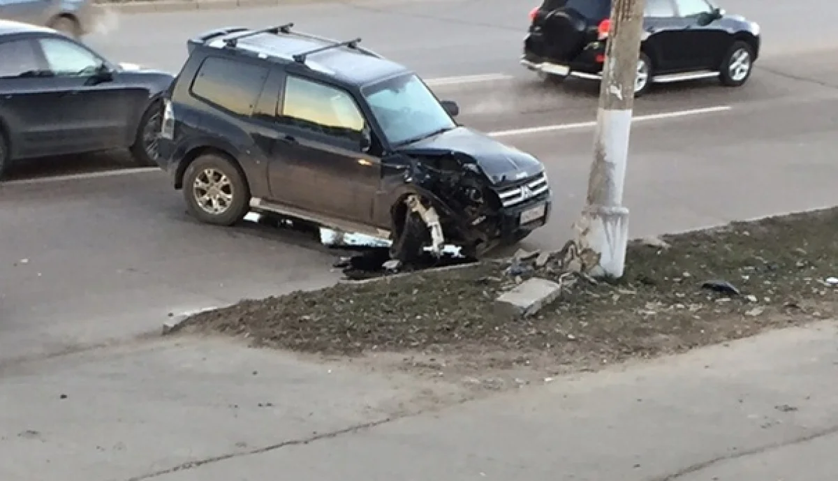 Как сообщают очевидцы, в Туле на пересечении ул. Дм. Ульянова и Одоевского шоссе водитель внедорожника «Мицубиси» на полной скорости протаранил опору ЛЭП. От удара у машины разнесло капот и вывернуло колесо.