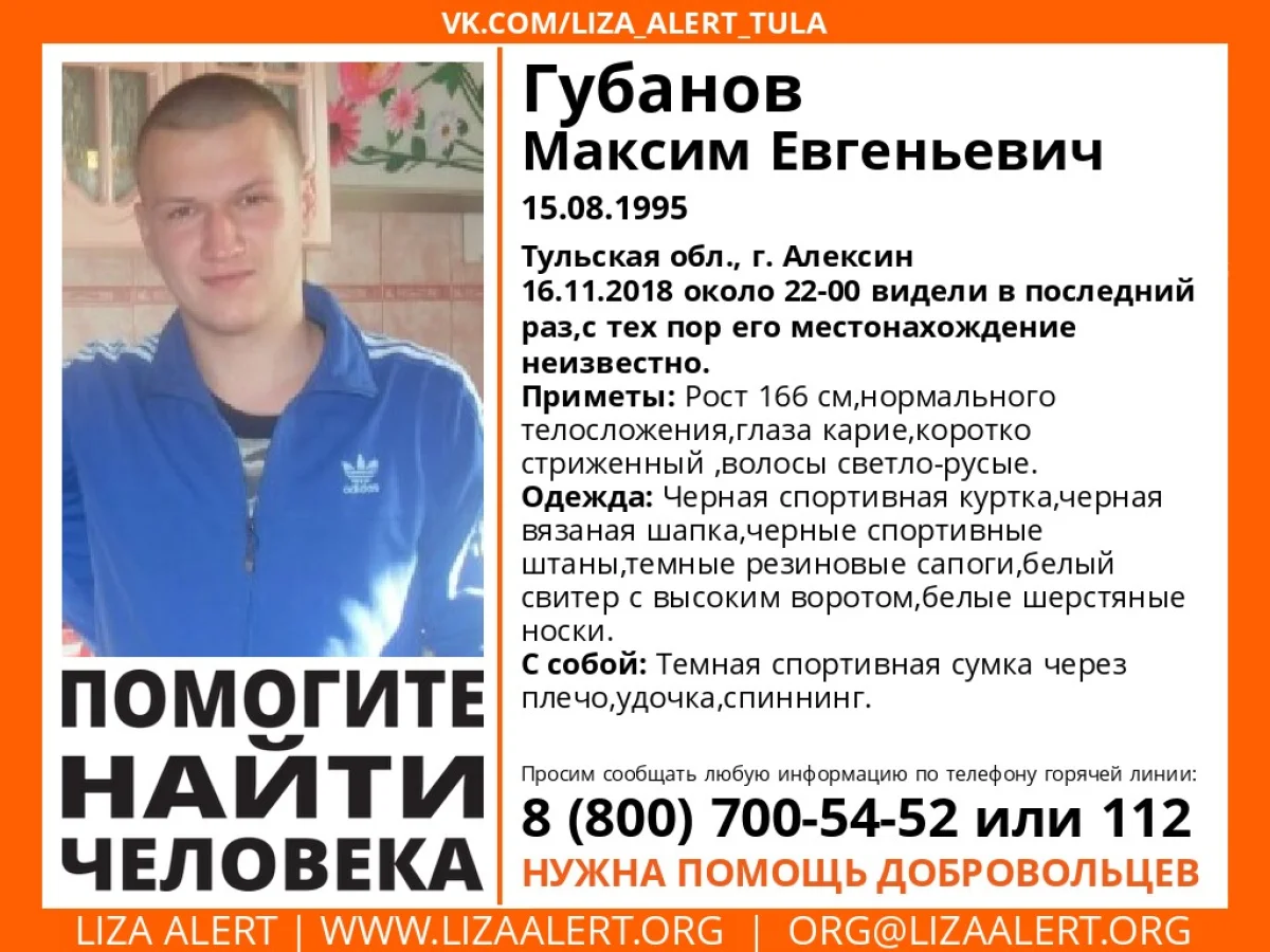 Как сообщается на странице добровольного поискового отряда «Лиза Алерт», в Алексине пропал 23-летний молодой человек - Губанов Максим Евгеньевич.