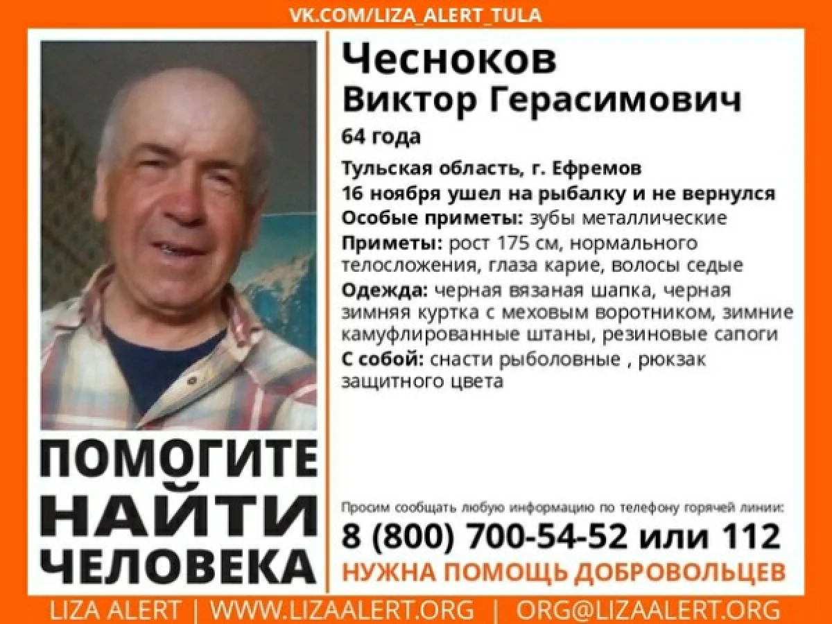 64-летний житель Ефремова Чесноков Виктор Герасимович 16 ноября ушёл из дома, предположительно на рыбалку. С тех пор его местонахождение неизвестно.