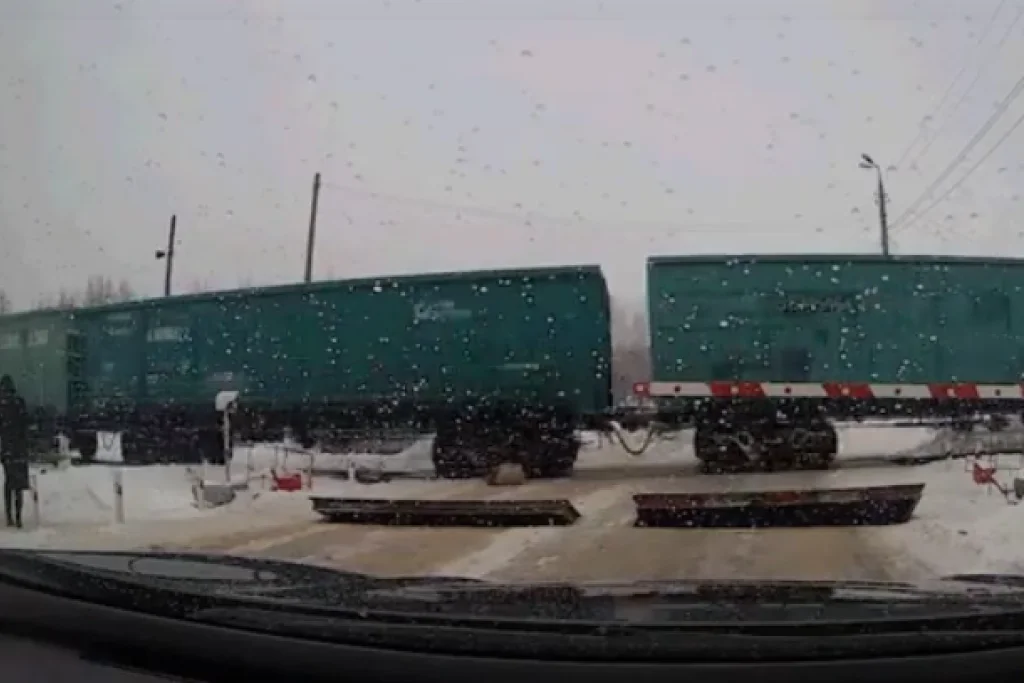 В ролике видно, что женщина стоит на переезде,в опасной близости от путей, и ждет пока проедет поезд.