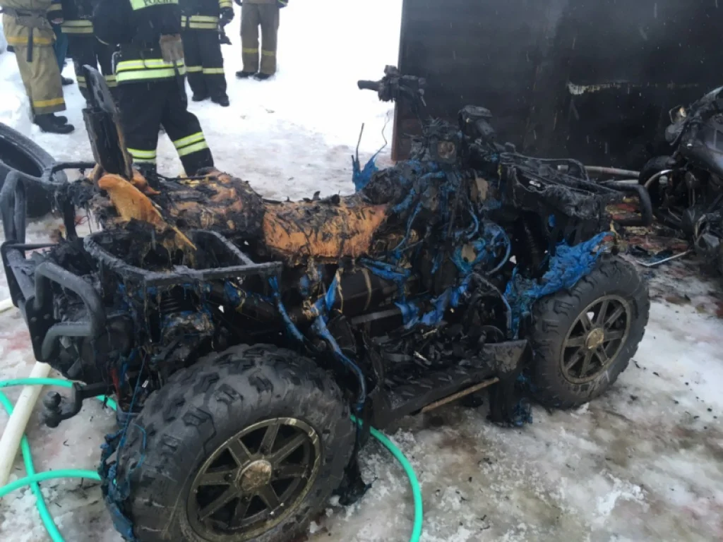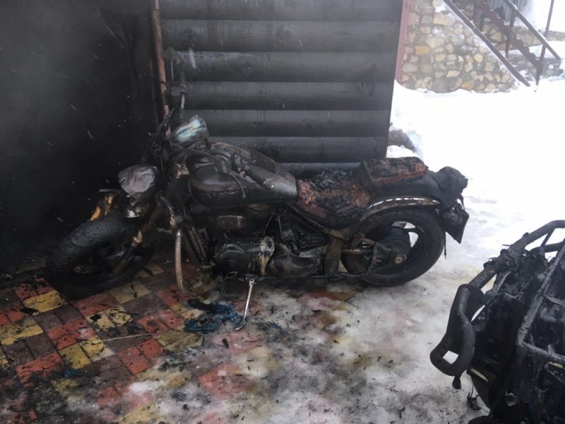 В результате происшествия гаражное помещение первого этажа выгорело по всей площади. Полимерные элементы квадроцикла и мотоцикла деформировались по всей площади.