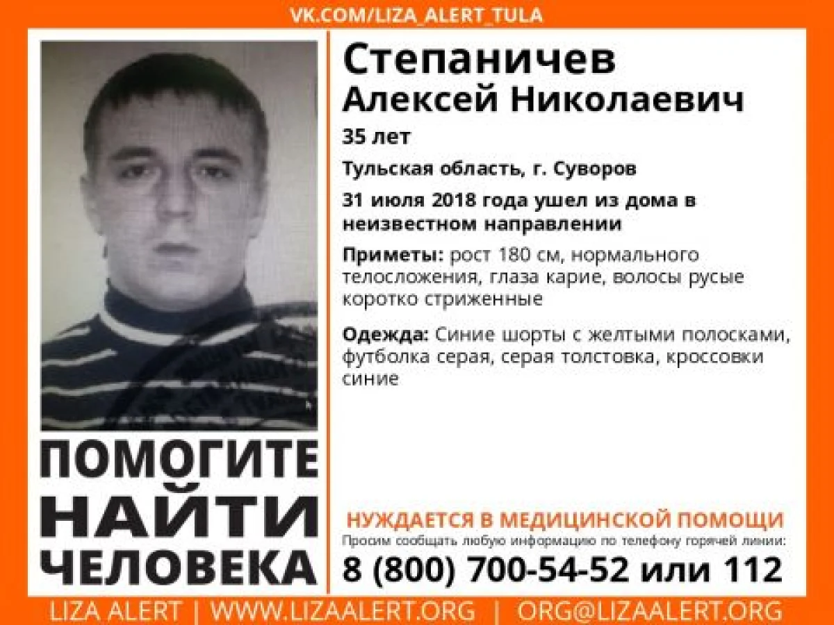 В Суворове пропал 35-летний Степаничев Алексей Николаевич.