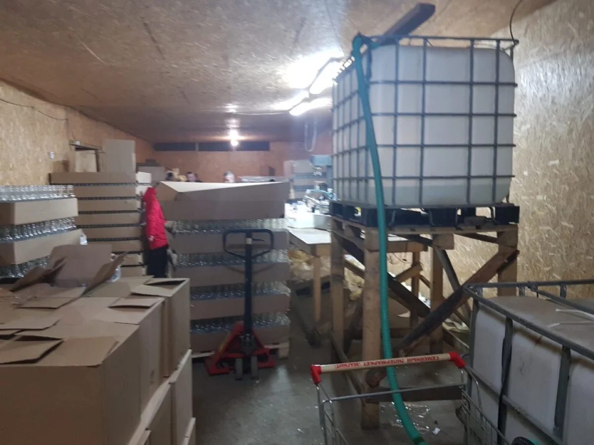 В нескольких помещениях находились ручная линия по розливу и упаковке алкоголя, почти 2 500 бутылок объемом 0.5 л с водно-спиртовой смесью, тара, колпачки, поддельные акцизные марки, более 1300 л водно-спиртовой смеси.