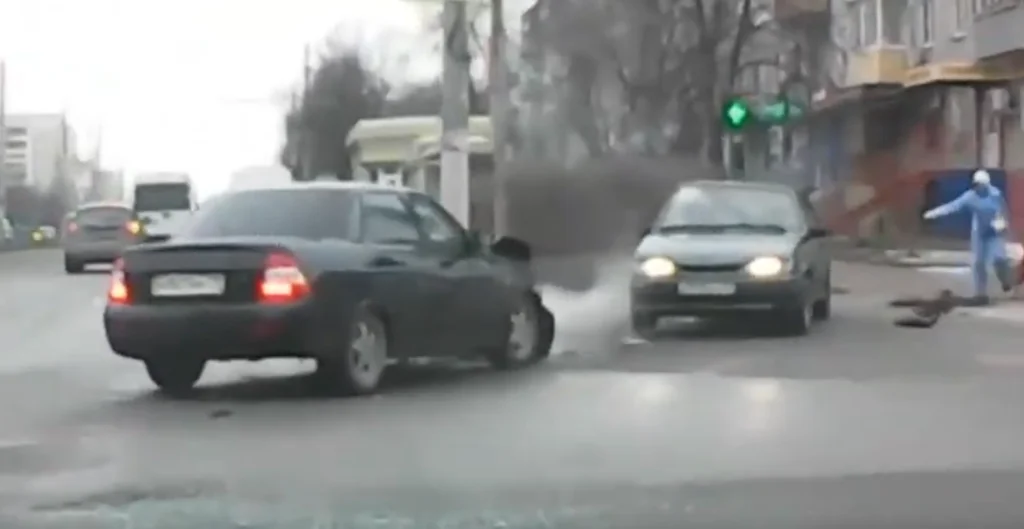 На кадрах — момент ДТП на перекрёстке улиц Ложевая и Калинина. После столкновения с «Приорой» ВАЗ-2114 вылетает на тротуар и чудом не задевает гуляющую там женщину и ее питомца.