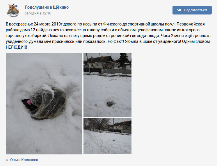 В группе «Подслушано в Щекино» в соцсети «Вконтакте» одна из подписчиц выложила страшные фото, на которых можно рассмотреть отрезанную собачью голову.