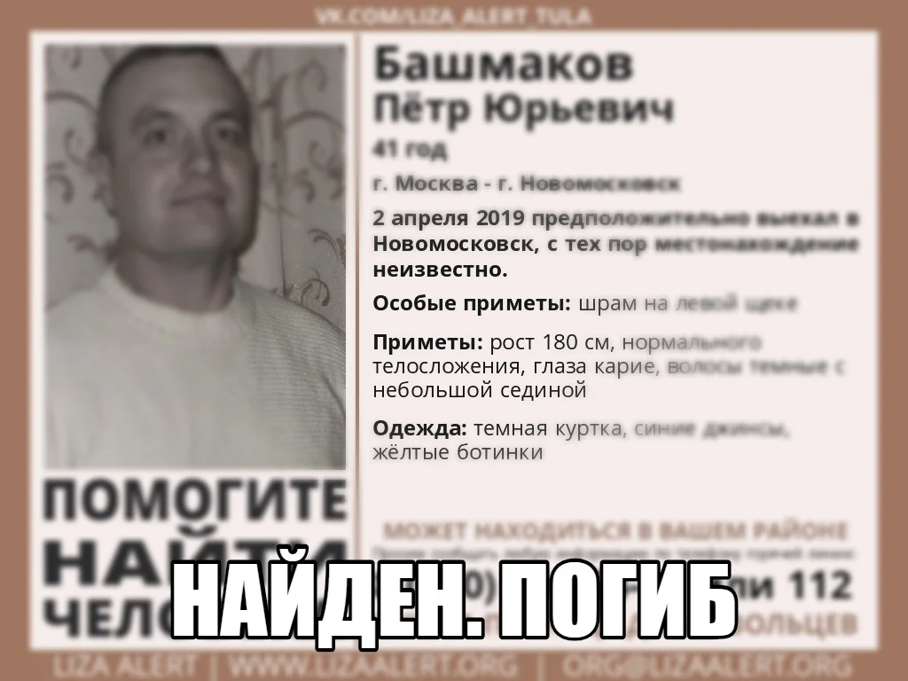 41-летнего Башмакова Петра Юрьевича разыскивали волонтёры поискового отряда «Лиза Алерт», а также полицейские из Тулы и Москвы.