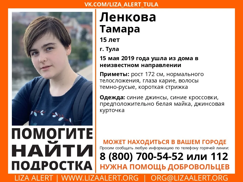 В Центральном районе Тулы пропала 15-летняя Ленкова Тамара. 15 мая 2019 года она ушла из дома в неизвестном направлении. До сих пор ее местонахождение неизвестно. Поисками ребёнка занимаются правоохранительные органы, волонтёры поискового отряда «Лиза Алерт» и неравнодушные туляки. Если вы что либо знаете о пропавшей девочке — просьба сообщать по указанным телефонам.