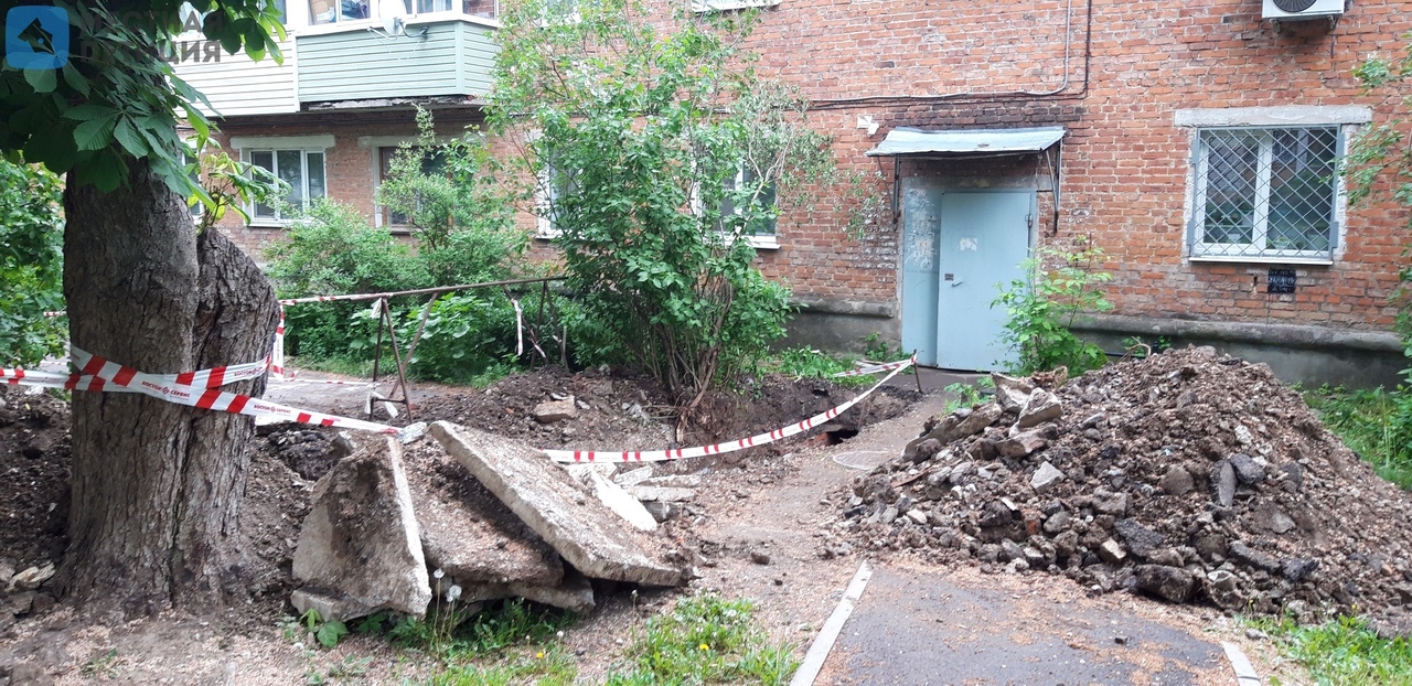 «Так выглядит двор дома на ул. Комсомольская, 171 уже неделю. Во вторник, 21 мая, разворотили, и до сегодняшнего дня нет никаких изменений в лучшую сторону, хотя нет!.. сигнальную ленту все-таки сделали))) Выход из подъезда — тропиночка шириной в 30см. В доме, и конкретно, в данном подъезде, живут пожилые люди и семьи с детьми...».