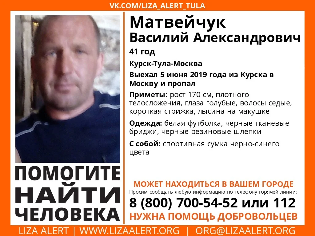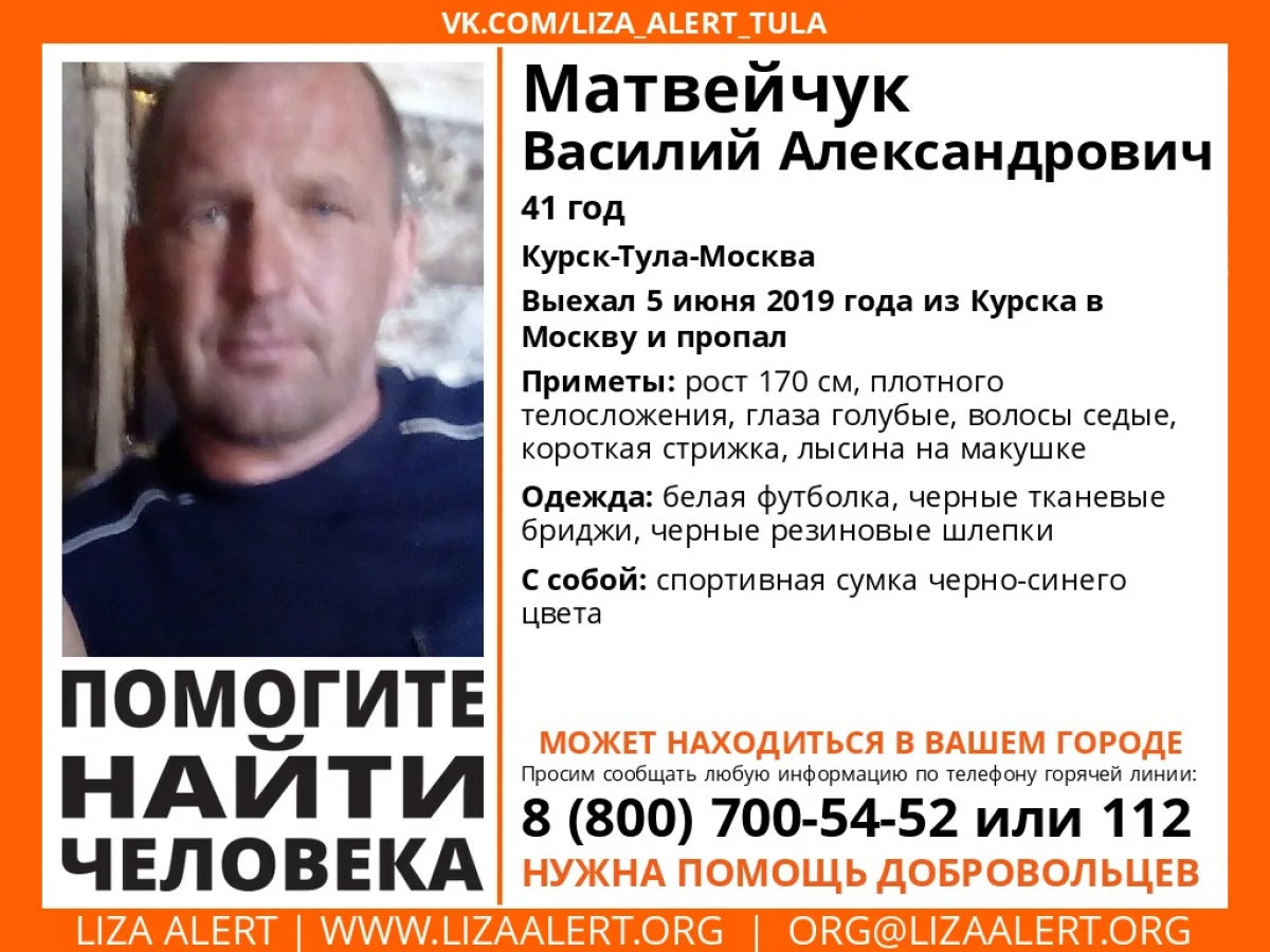 В Тульской области пропал Матвейчук Василий Александрович, 41 год. 5 июня 2019 года он выехал из Курска в Москву