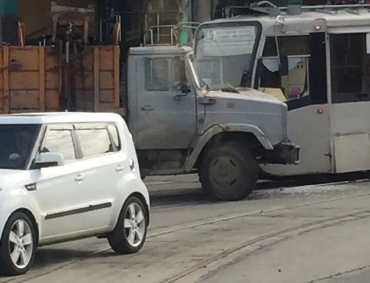 Как сообщают очевидцы, мусоровоз разворачивался на трамвайных путях, но не успел завершить манёвр.
