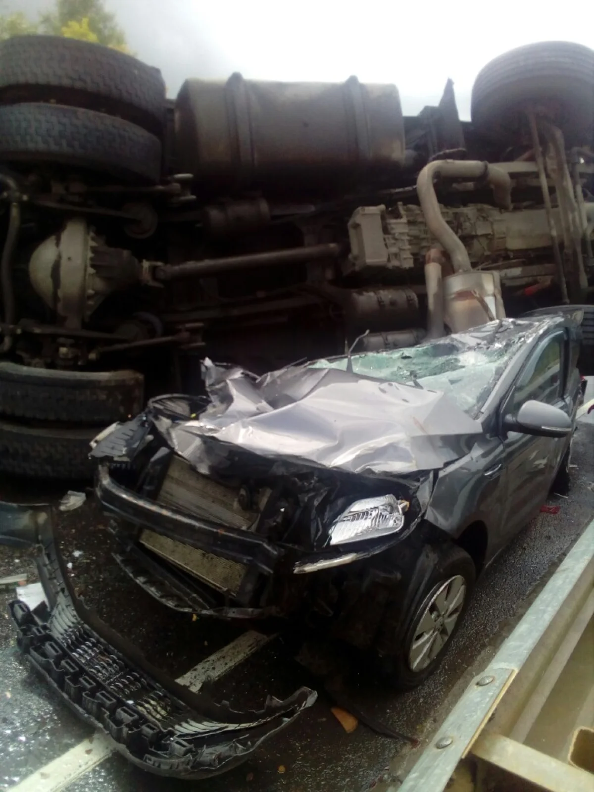 Сегодня днем под Тулой в районе д. Берники произошло страшное ДТП. На трассе «Калуга-Тула-Михайлов-Рязань» столкнулись фура и легковушка. От удара фуру перекинуло прямо на автомобиль. Под тяжеловесом легковушка потеряла заводской вид, теперь она похожа на груду металла.