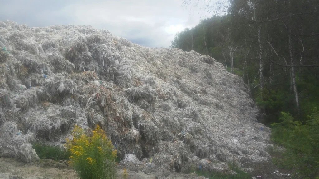 На предприятии пояснили, что здесь складируется ил, который скапливается с очистных сооружений. На самом же деле, куча отходов — сплошной пластик, который появляется в процессе очистки и переработки картона. От свалки идет резкий химический запах, ее стоки уходят в овраг. На месте свалки уже погибли несколько деревьев.