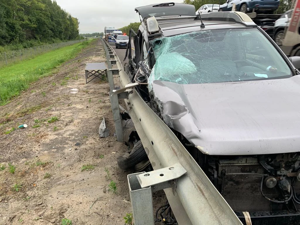 Но опасные маневры не закончились: седан остановило только ограждение, установленное на трассе. В результате ДТП пострадали четыре человека, в том числе один несовершеннолетний ребенок, пассажиры автомобиля «Nissan» с травмами различной степени тяжести были госпитализированы; несовершеннолетняя девочка 2013 года рождения, которая с различными телесными повреждениями была госпитализирована, в момент происшествия располагалась на заднем пассажирском сидении в специальном детском удерживающем устройстве; а так же пострадал пешеход (водитель автомобиля «МАЗ»), который с травмами различной степени тяжести был госпитализирован.