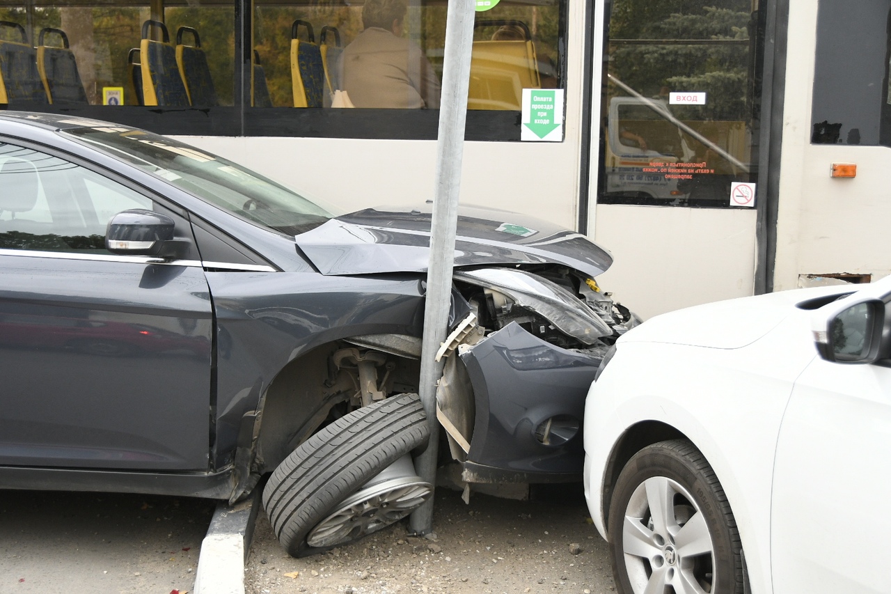 В результате ДТП у легкового автомобиля сильно помят бампер, ее зажало между трамваем и знаком. На месте работает эвакуатор.