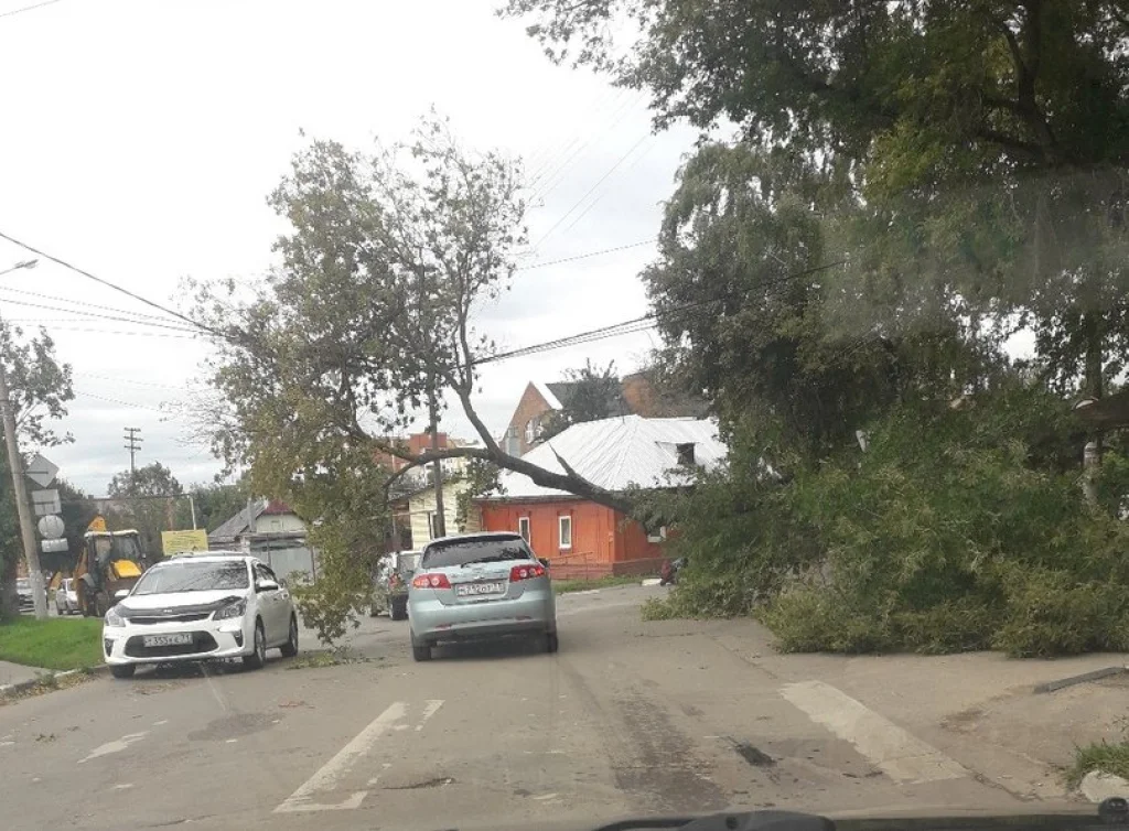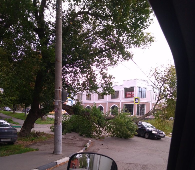 В Туле на улице Шухова дерево повисло прямо над проезжей частью. Произошло это из-за сильного ветра, который продолжается в Туле со вчерашнего дня.