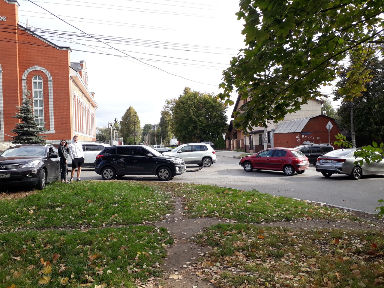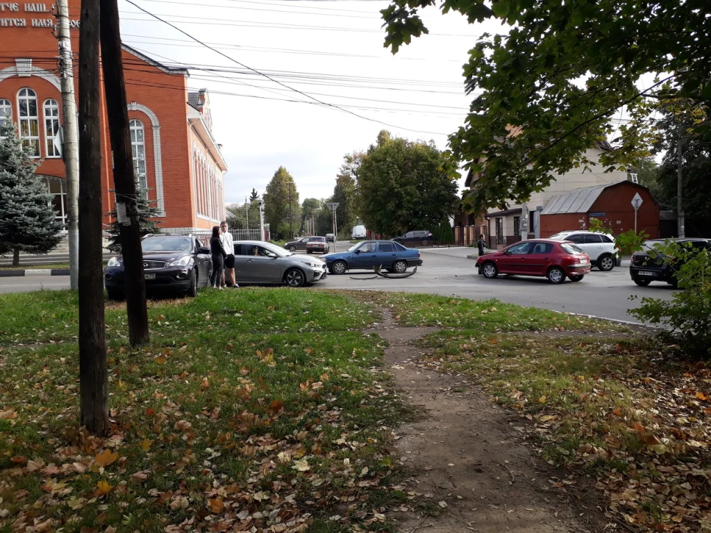Утреннее ДТП: в Туле на ул. Станиславского «Инфинити» забрался на газон, а «Пежо» потерял бампер