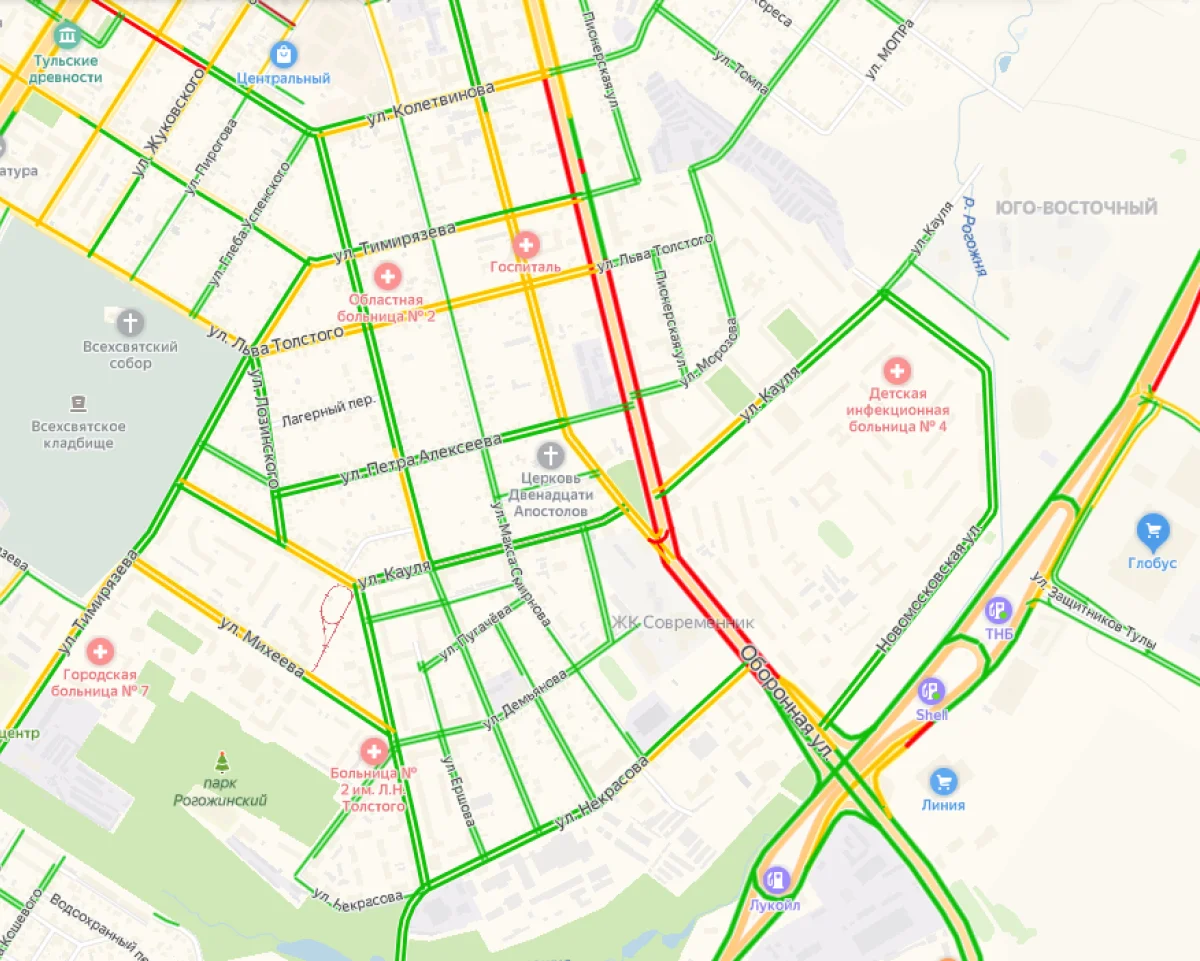 Днем 26 декабря в Туле на улице Оборонной произошло ДТП. На трамвайных путях столкнулись два внедороджника. Они перегородили проезжую часть. Трамваи стоят в обе стороны, остальной транспорт также не может проехать.