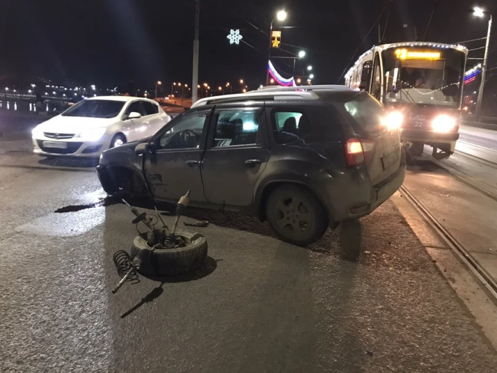 Вчера, 8 января, на Пролетарском мосту в Туле произошло ДТП, в результате которого один из автомобилей потерял колесо.