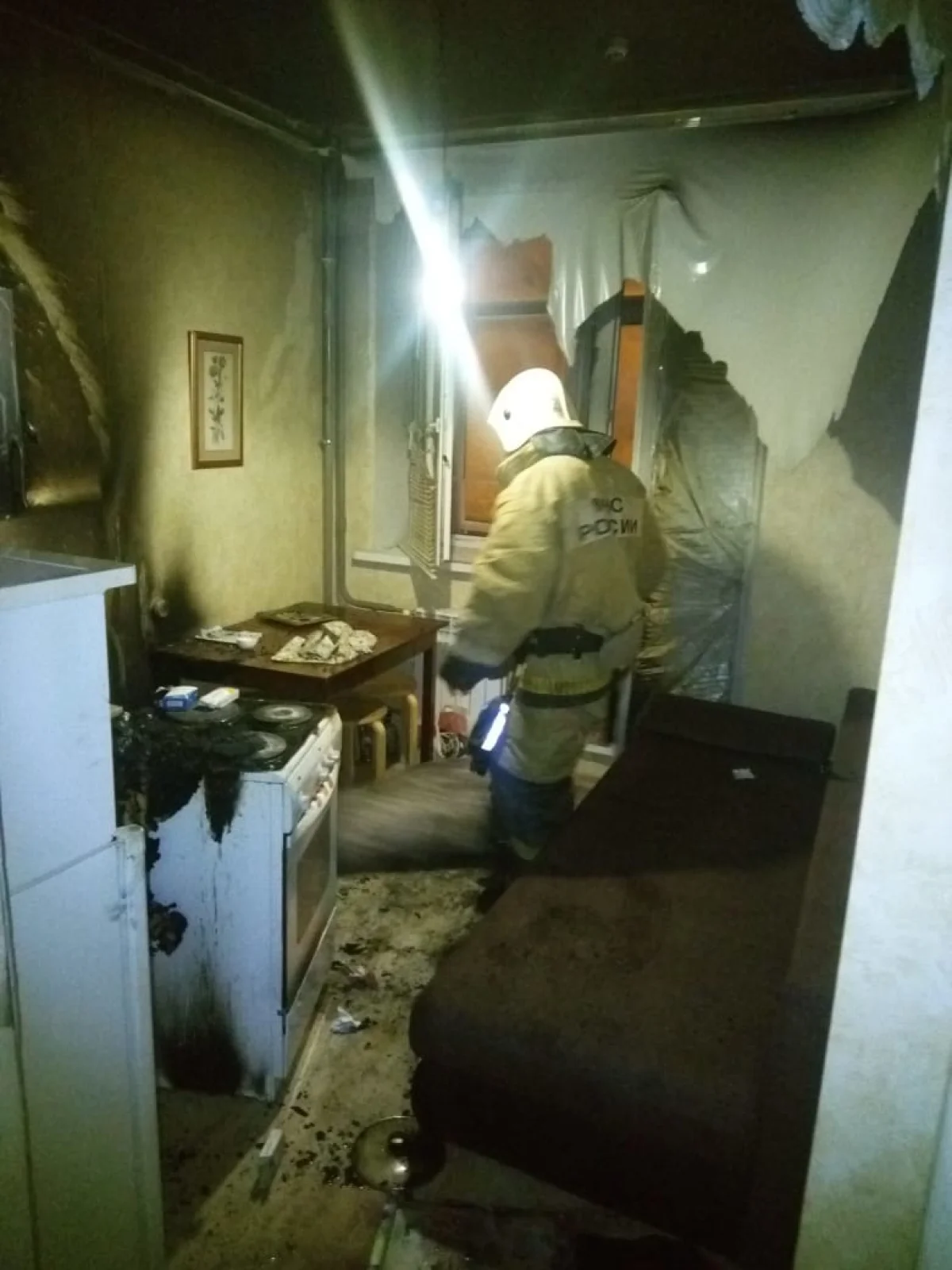 В результате пожара на кухне размером 2х3 м обгорела плита и мебель, по всей площади закоптились стены и потолок.