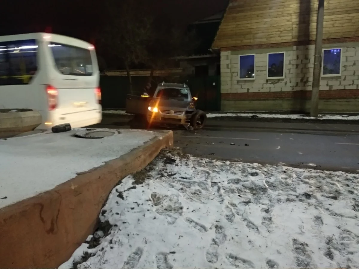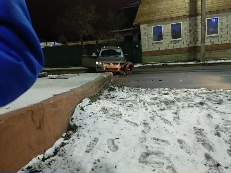 Как сообщили очевидцы, авария произошла вчера, 9 февраля, на ул. Вильямса около дома № 7. Кроссовер Volkswagen Touareg на скорости врезался в угол бетонного основания нескольких колодцев, после чего автомобиль отбросило на противоположную сторону дороги и лишилась левого переднего колеса. Отметим, что бетонная конструкция частично находится на дороге.