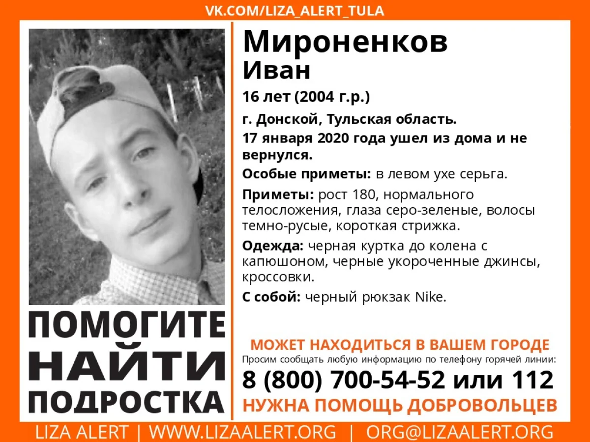 В Тульской области пропал 16-летний житель города Донской Иван Мироненко. Как заявили родственники, подросток ушёл из дома 17 января 2020 года и так и не вернулся.