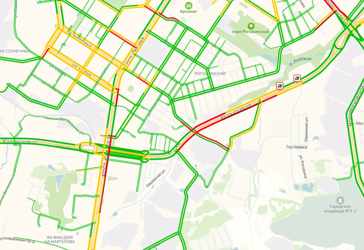 Судя по Яндекс.Картам, движение затруднено по проспекту Ленина от поворота на ул. Скуратовскую до ул. Станиславского, по ул. Рязанской, Оборонной, Первомайской и Советской.