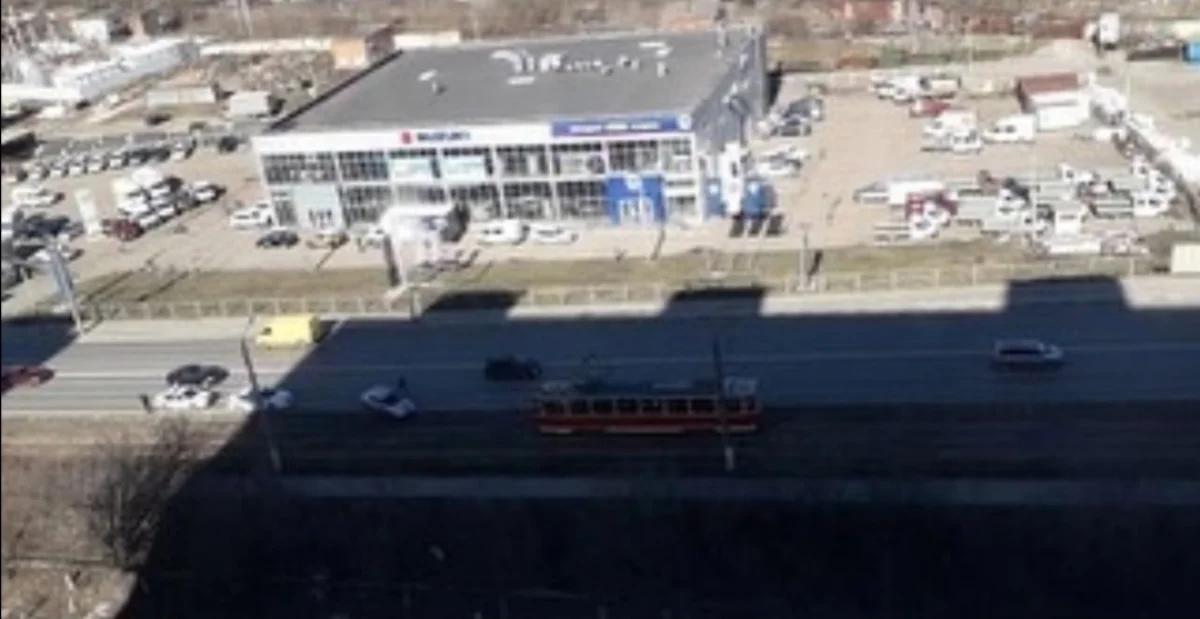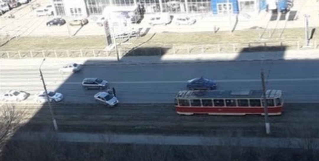 Водитель врезался в бордюрный камень и заехал на трамвайную линию. В результате чего трамваи встали в месте ДТП.
