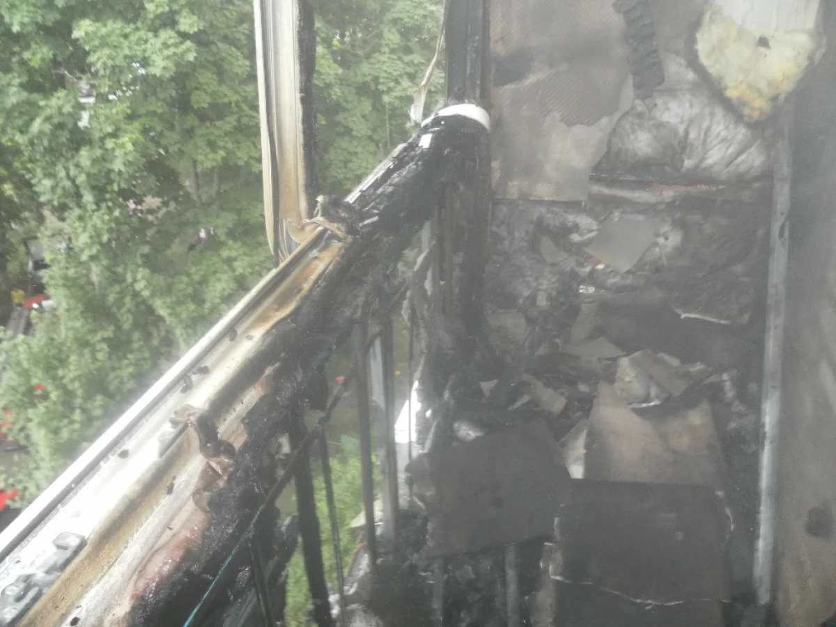 Загорелись вещи, обгорел пол и стена, обгорел карниз и балконная рама соседнего балкона.