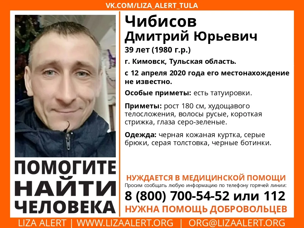 В Кимовске Тульской области разыскивают 39-летнего Чибисова Дмитрия Юрьевича. С 12 апреля 2020 года его местонахождение не известно. Пропавший нуждается в медицинской помощи.