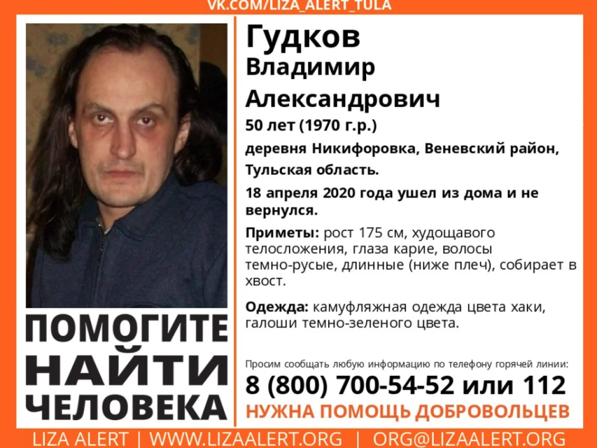 В деревне Никифоровка Веневского района Тульской области разыскивают пропавшего 50-летнего Гудкова Владимира Александровича. Он ушел из дома 18 апреля 2020 года и не вернулся.