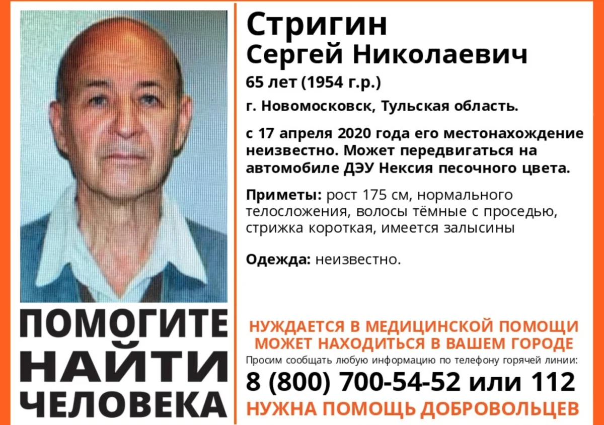 В Новомосковске Тульской области пропал 65-летний Стригин Сергей Николаевич. С 17 апреля 2020 года его местонахождение неизвестно. Может передвигаться на автомобиле "Дэу Нексия" песочного цвета. Пропавший нуждается в медицинской помощи.