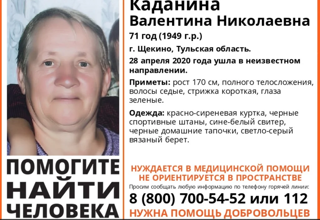 В г.Щекино разыскивают пропавшую 71-летнюю Каданину Валентину Николаевну. 28 апреля женщина ушла в неизвестном направлении и не вернулась. Пропавшая нуждается в медицинской помощи, она не ориентируется в пространстве.