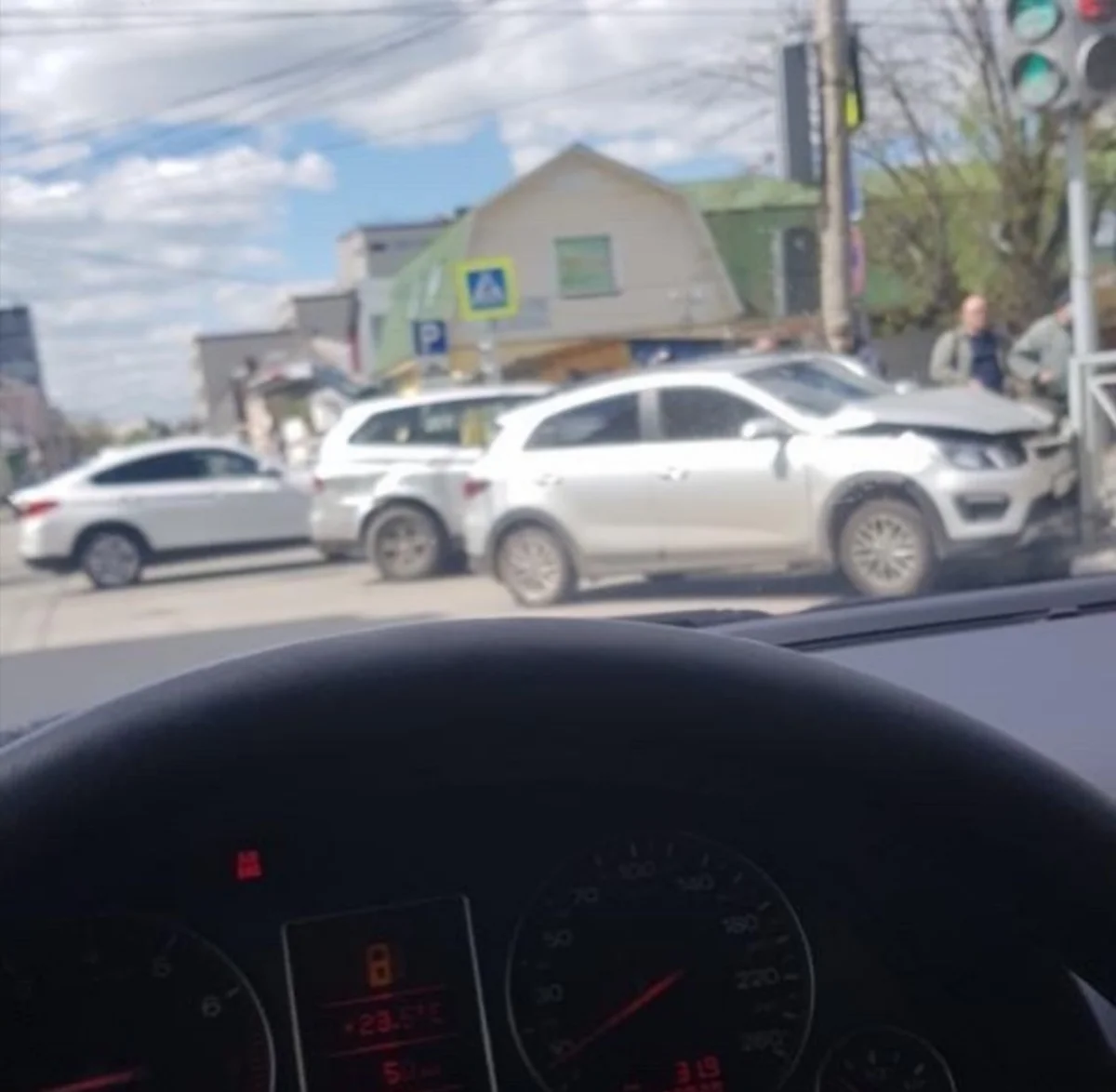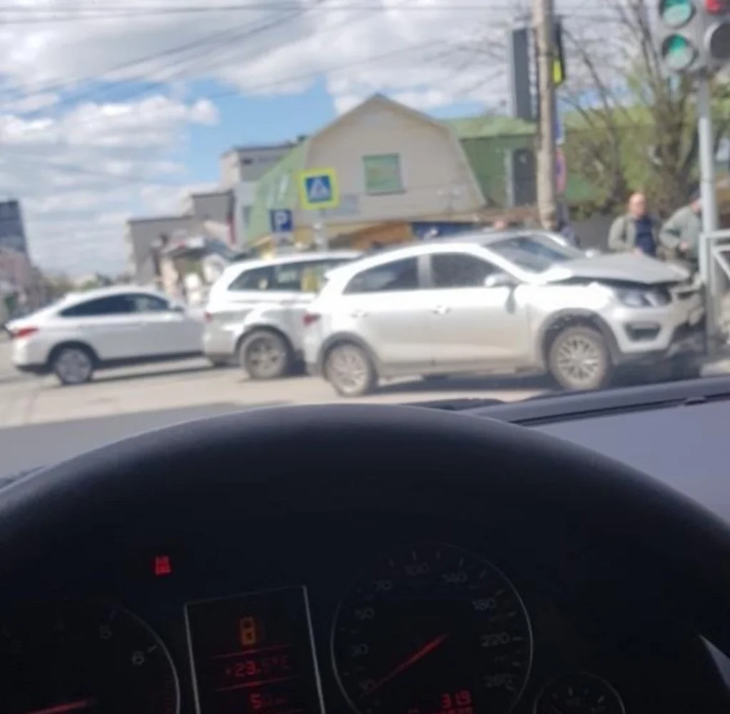 Сегодня днем, 13 мая, в Туле на перекрестке ул. Каминского и ул. Жуковского столкнулись две иномарки. Дорогу не поделили SsangYong и Kia.