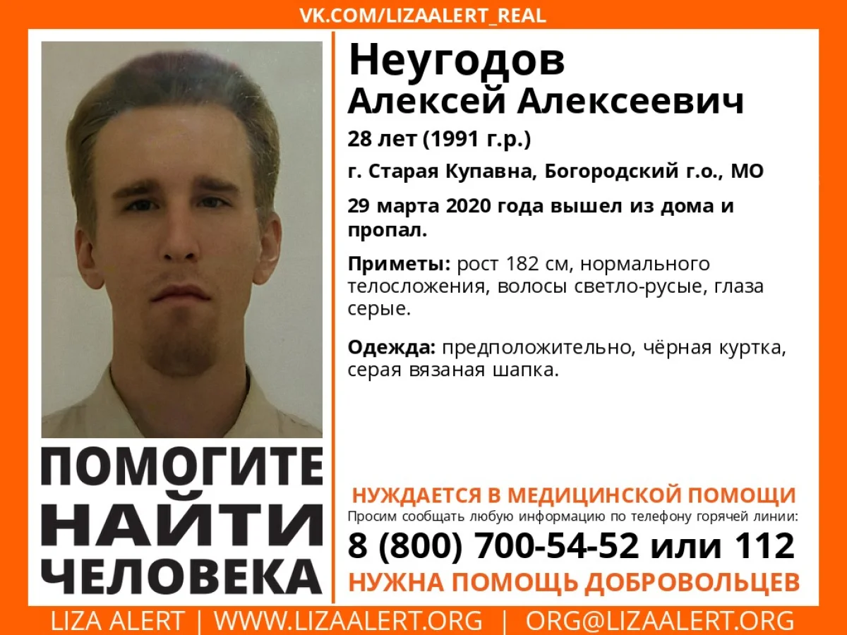 Разыскивается пропавший 28-летний Негодов Алексей Алексеевич. Молодой человек пропал 29 марта в городе Старая Купава Московской области. Он вышел из дома и не вернулся, с тех пор его местоположение неизвестно. Пропавший может находиться в Тульской области. Молодой человек нуждается в медпомощи.