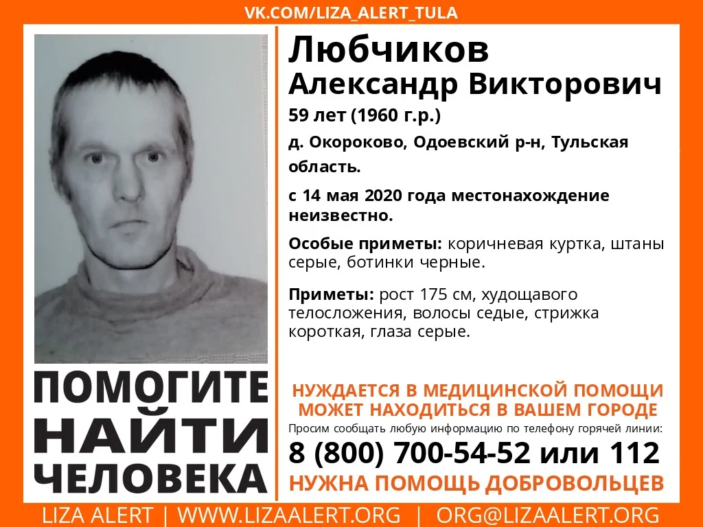 В Одоевском районе в деревне Окороково разыскивают пропавшего 59-летнего Любчикова Александра Викторовича. С 14 мая 2020 года его местонахождение неизвестно. Пропавший нуждается в медицинской помощи.