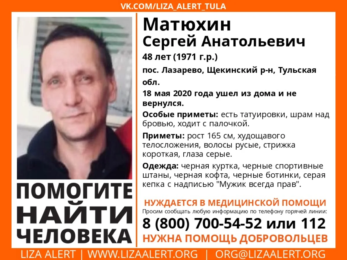 В поселке Лазарево Щекинского района разыскивают пропавшего 48-летнего Матюхина Сергея Анатольевича. 18 мая 2020 года он ушел из дома и не вернулся.