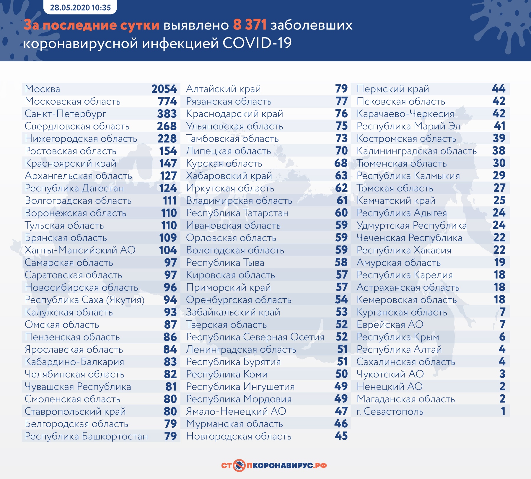 В "лидерах" рейтинга по заболеваемости снова оказался Санкт-Петербург (383), Московская область (774) и Москва (2054).