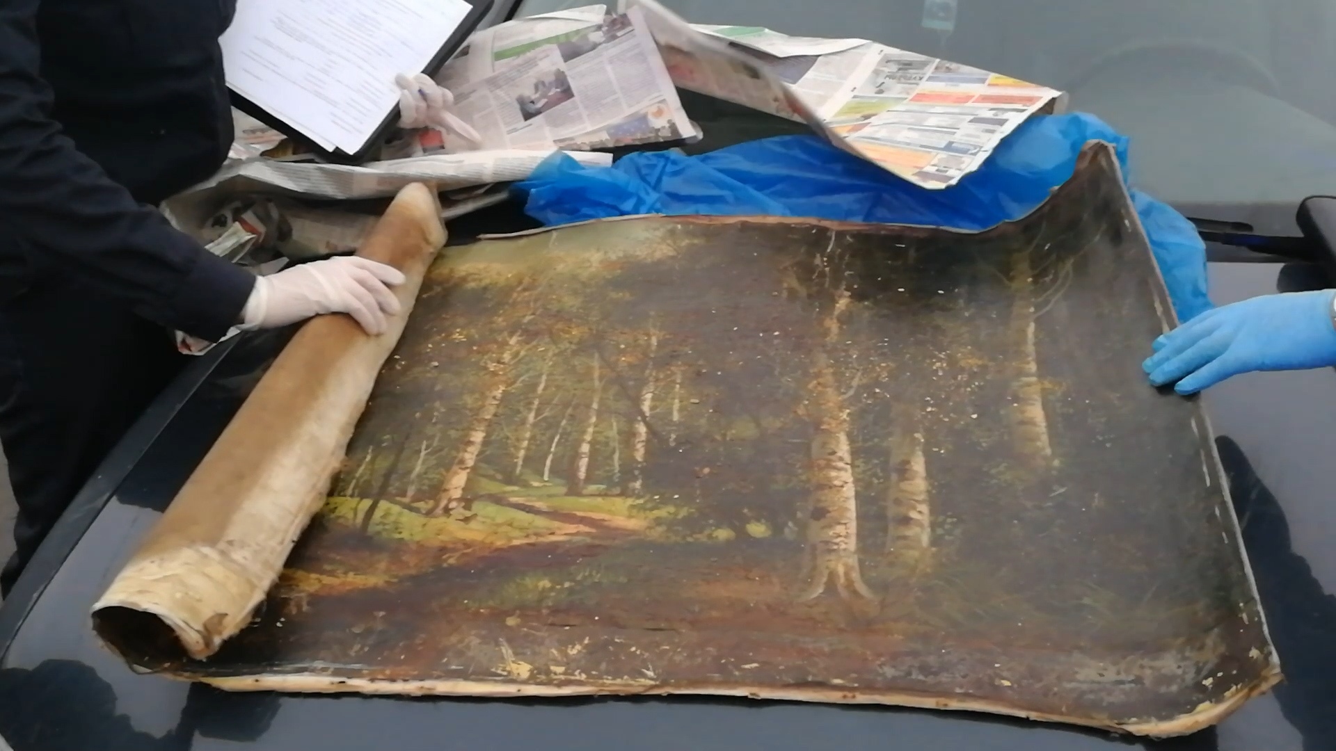Двое тульских продавцов Юлия и Тимур презентовали свой “подлинник”, развернув сверток полотна на капоте машины. По рассказанной легенде, картина великого художника досталась им от прабабушки, после чего поведали историю реставрации пейзажа. Однако, продать картину им все же не удалось, ведь на месте их задержали сотрудники полиции. При этом, девушка попыталась сбежать с места происшествия, но все же ей не удалось этого сделать.